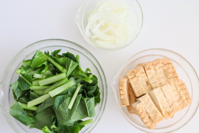 ① 厚揚げは半分に切って1cm幅程度に切る。小松菜は3cm程度に切る。たまねぎは薄切りにする。