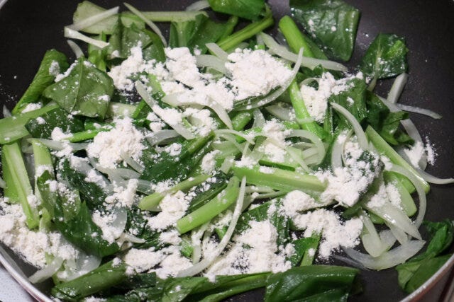 ③ しんなりしたら弱火にして薄力粉をふり入れ、なじませながら炒め合わせる。