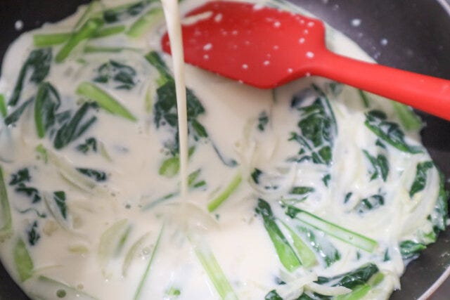 ④ 無調整豆乳を少しずつ注ぎながら混ぜ合わせる。