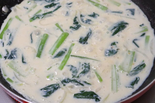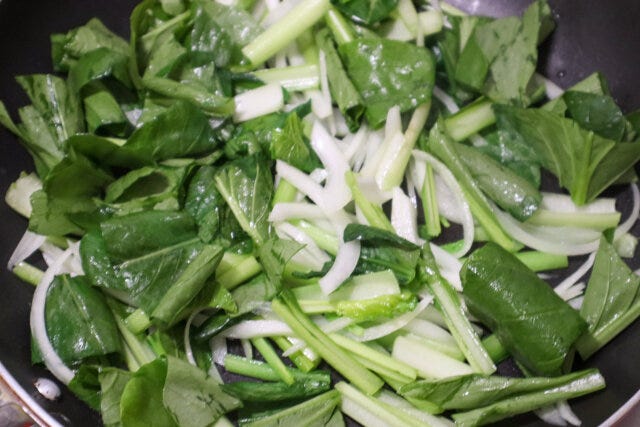 ② フライパンにオリーブオイルを熱し、たまねぎ、小松菜を炒める。