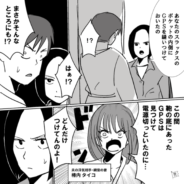 諦められない主人公は、夫のスラックスにGPSを縫いつけました。