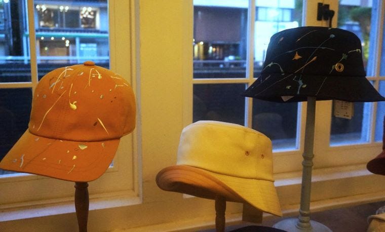 水野ミリナーは新ブランド「B.ポッピング」を立ち上げる。「ボーイッシュポップ」をコンセプトに、はじける気分でかぶれるユニセックススタイルを提案する。刺繍でペンキペイントを表現し、キャップ(9000円)はベージュ、イエロー、ネイビーの色でハッピーなムードを演出する。バケット(9500円)はリバーシブルでオフホワイト、ベージュ、オレンジ、ネイビー。