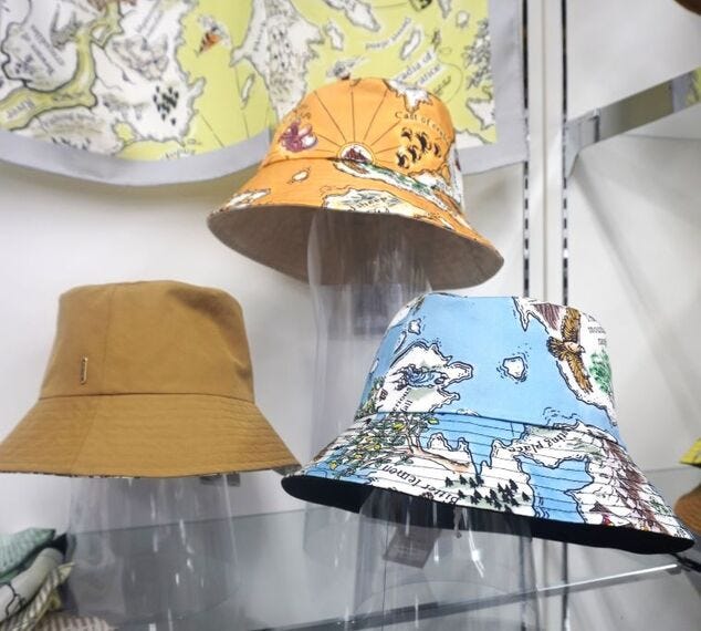 オーロラのオリジナル「ビューランス」は「理想郷へ向かって」がテーマ。帽子は、地図柄の布帛バケットハットを提案する。ブルー、オレンジ、レモン、グリーンの明るい色の柄物を揃え、カーキやブラックなど無地とのリバーシブル仕様にし、気分やシーンで選べる楽しさがある。UV(紫外線)カット加工で手洗可能。1万1000円。天然素材はラフィアのブレードハットを加えるなど、バリエーションを広げた。