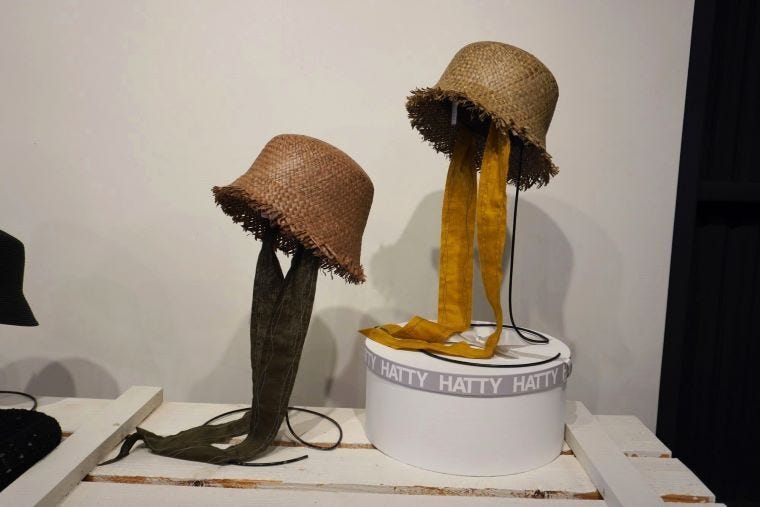 林八百吉は国産のオリジナルブランド「ハティー」で、リラックス感をテーマにしたハットやベレー、クロッシェを揃える。柔らかく有機的な印象のオリジナル柄のほか、垂らしても結んでも可愛いひも付きなど、自由にかぶれる気軽さやリラックス感を重視した。曲線を有機的に描いたオリジナル柄ハットはピーチ、ミントなどの春夏らしい3色。1万3000円(参考価格)。ラフィアのハットはつば先をフリンジにし、顔の左右にはリボンを垂らして、若い層に訴求できるトレンド感を演出する。リボンは垂らしたままでも、後ろで結んでも良い。ナチュラル、カーキ、ブラック。1万6000円。
