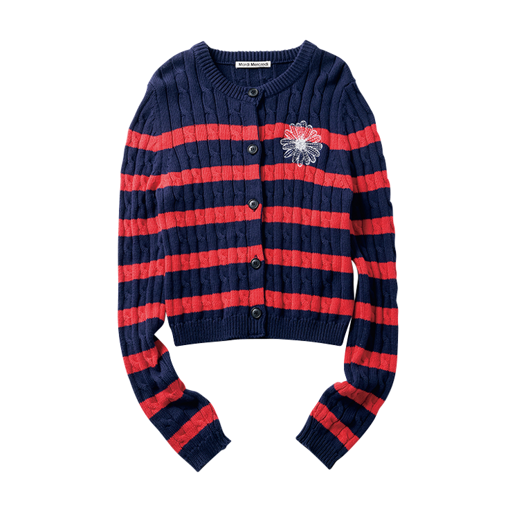 ネイビーMIXで赤の派手さを目立たなくさせる作戦!胸元のロゴがおしゃれ。