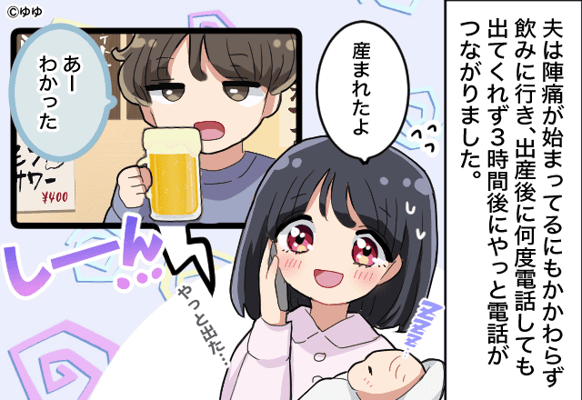 3時間後にやっと電話にでた夫に「産まれたよ」と伝えましたが、夫は「あーわかった」と言っただけでした。
