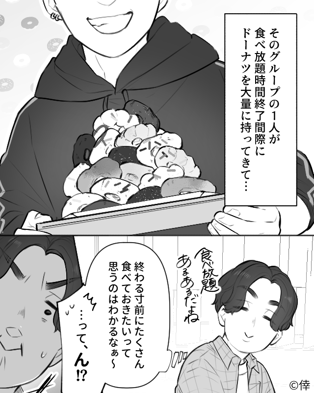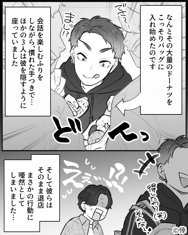 食べ放題のお店で、隠れてドーナツを持ち帰った男性グループ。