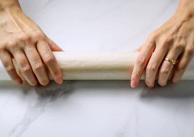 ⑧ オーブンシートに移し、転がしながら生地の太さを整え表面をなめらかにします。オーブンシートをきつくしめながら転がしたり、カードなどを使って生地をしめるときれいになります。