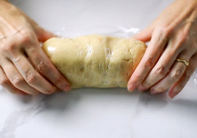 ⑥ 多少ポロポロしていてもよいので、ラップに移して手で押さえつけながらクッキー生地の中の隙間をなくします。