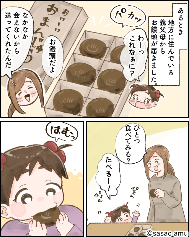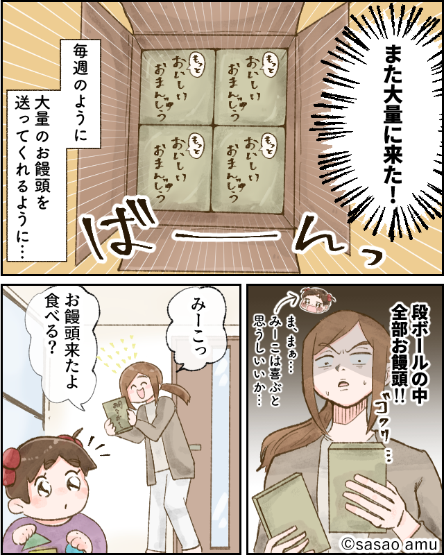 娘のために段ボールいっぱいのお饅頭を送ってくれた義父母。