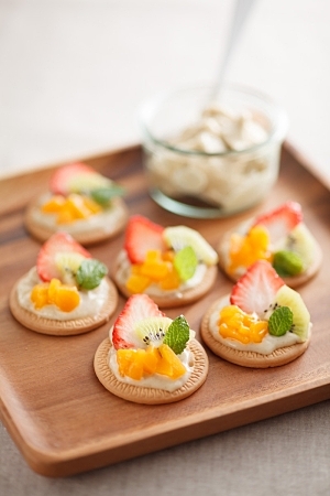 ビスケットの上にヨナナスとフルーツを乗せて。