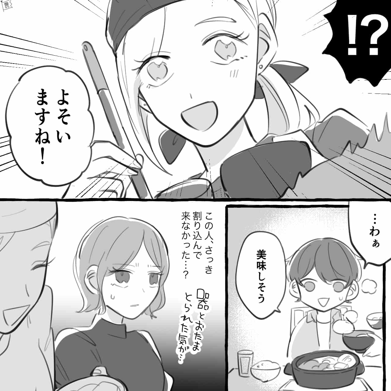 正解は「器などを主人公から取り上げてよそい始めた」でした。