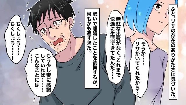 主人公に感謝せず、勢いで離婚してしまったことに後悔する夫なのでした。