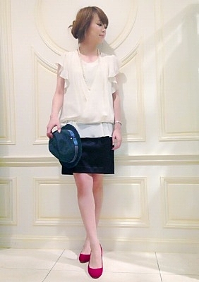 キュート系トップスには必ずブラックのパンプスを。