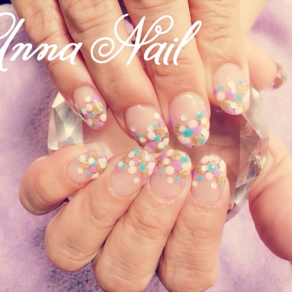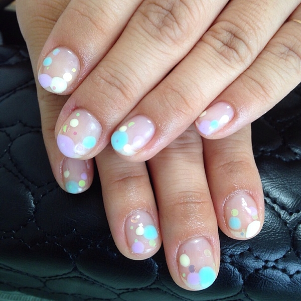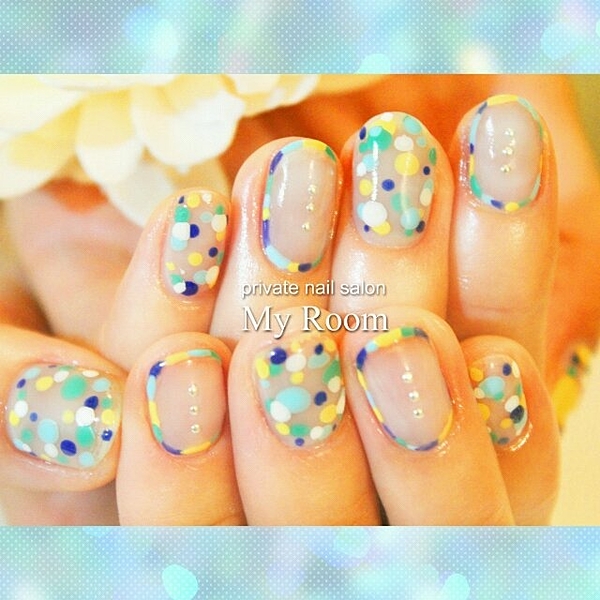 ミルキーカラーをベースに、ブルー、ピンク、イエロー、グリーン・・・カラフルなドットがポップな印象に♪