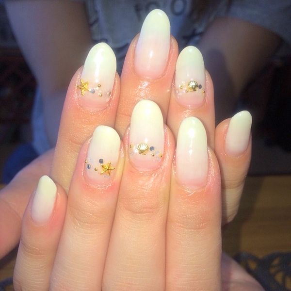 yuki ... ♡ ピンク、白、ベージュクリアラメの縦グラデに、星のカケラジェルでキラキラ✨ 薬指はシェルパーツ、パール、ターコイズを載せて夏先取り! キラキラかわいい夏ネイルになりました♩ http://t.co/bNAJlhw6Ll
