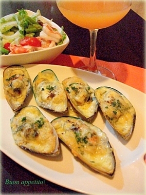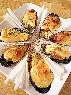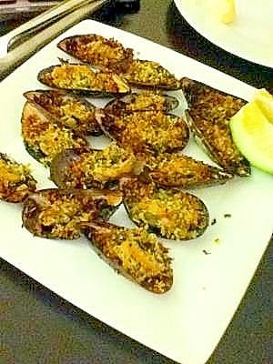 こんがりチーズとガーリックバターで、とってもおいしいムール貝に♪