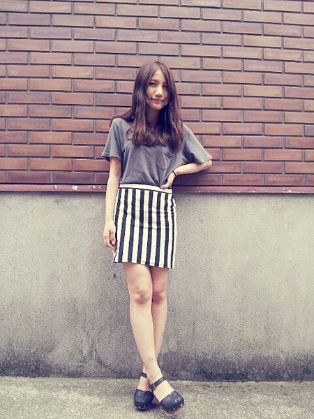 太めピッチのストライプが印象的なスカートは、膝上丈にすることで重たくならずスッキリ穿きこなせるシルエットにこだわりました。