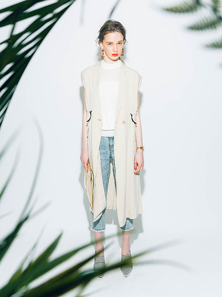 繊細なレース生地とピーチ生地の異素材ドッキングしたレースジレです。ヘムの形状がドレープするように意識してパターン取りをしています。羽織る事でIライン見えでスタイルアップ効果があります。