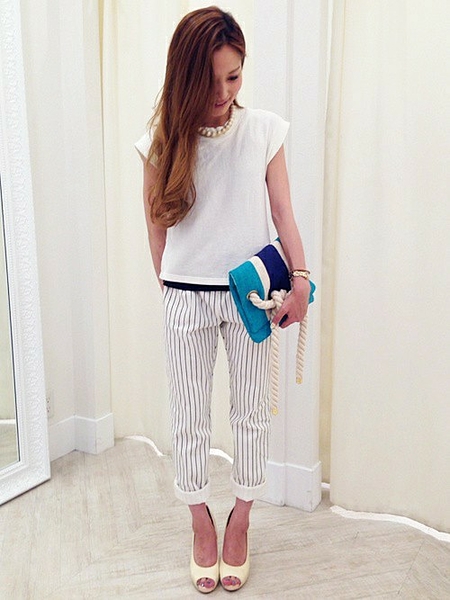 ストライプの縦のラインで脚長効果も期待出来るのが嬉しいデザインです。