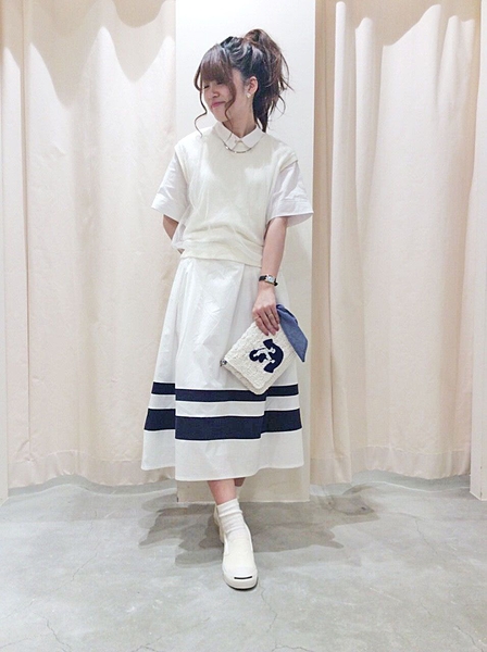 下に広がるタイプでウエストラインにはリボンが♪綺麗ラインに見せる時はトップス短めがおすすめです。