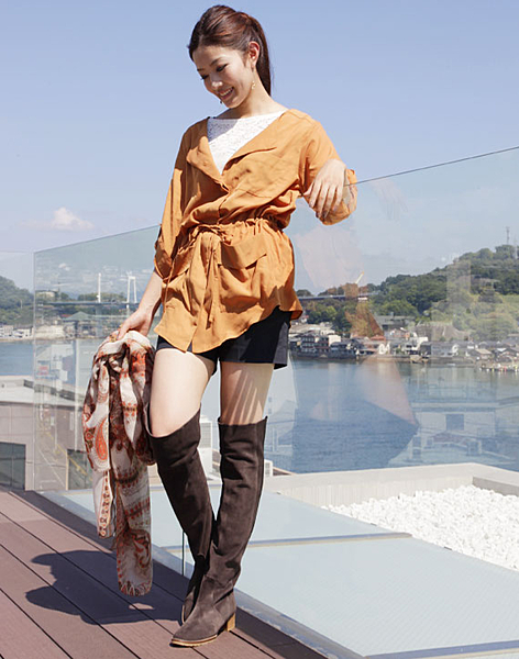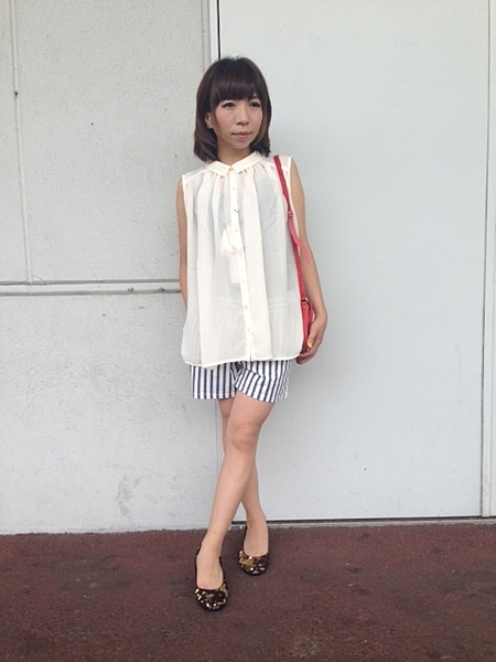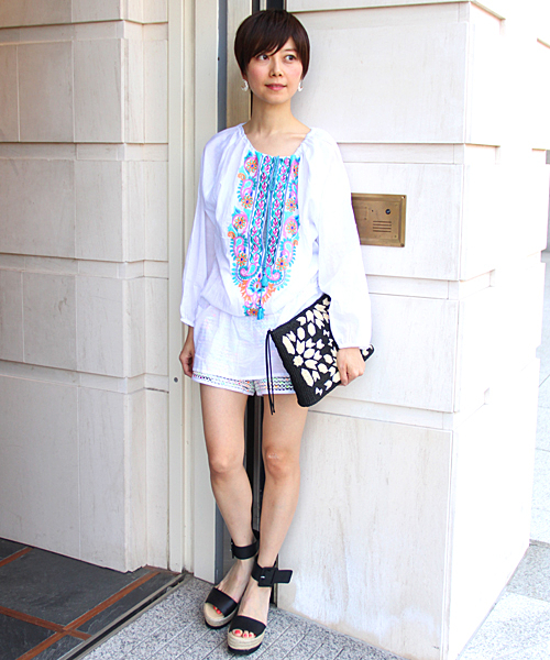 ショートボトムに合わせるチュニックは短め丈のAラインのものオススメ。スタイル良くみせてくれます。