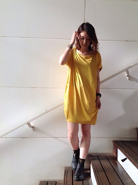 ボリュームのあるサーキュラーシルエットがキレイなボディラインを演出。ボトムは細身のものを合わせるとキレイに見えます。