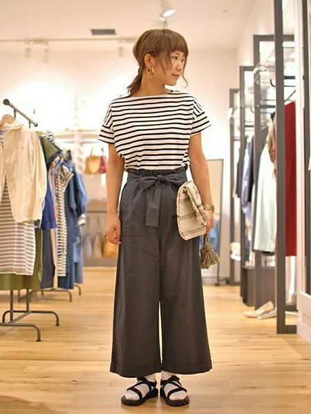 ゆったりとしたTシャツはガウチョパンツの中に入れればこなれ感アップ。