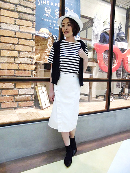 デニムスカートも白を選ぶとオフィスにも使えるきれいめコーデが叶います。