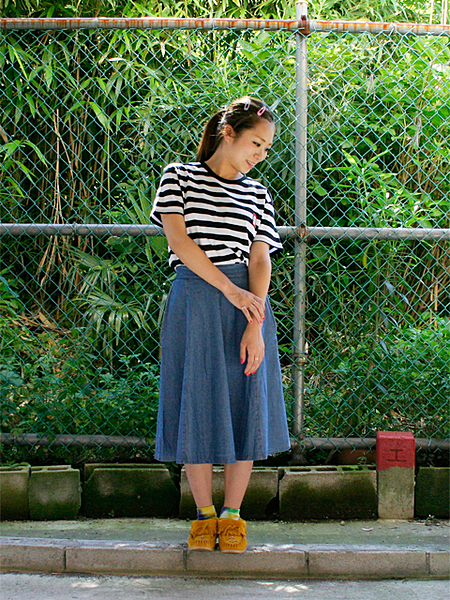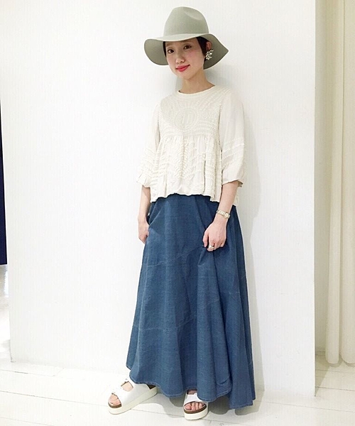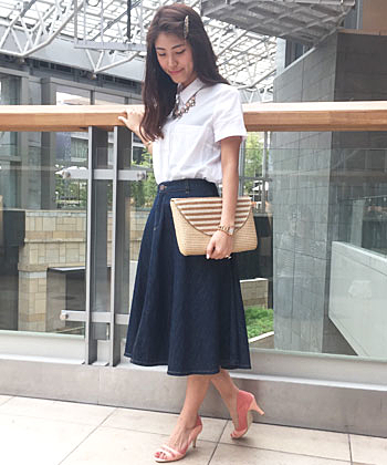 トレンドのミディ丈スカートは、夏はデニムがおすすめです。