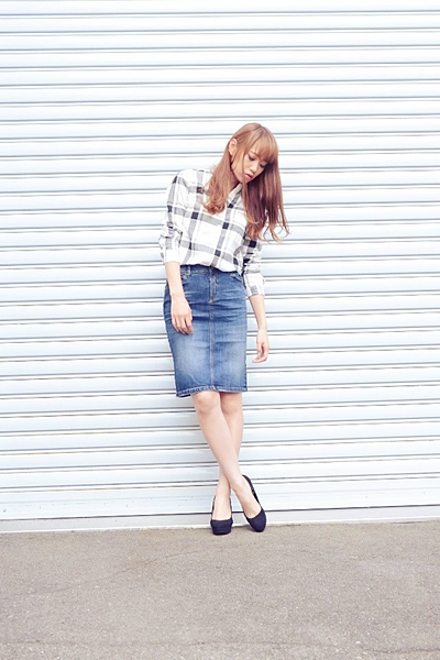 シンプルなチェックシャツはデニムスカートと相性抜群です。