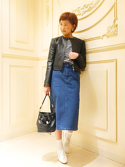カジュアルなデニムスカートも、黒のレザージャケットを合わせれるとレディライクなスタイルに変身します。