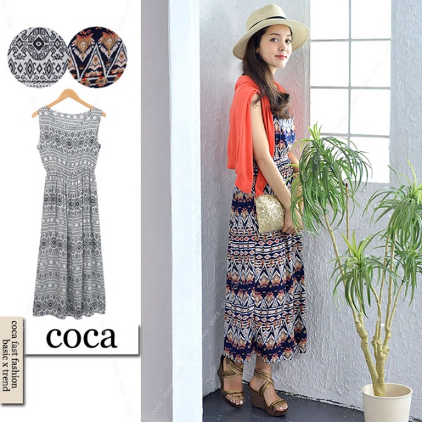 全身に入った柄がとってもオリエンタルな雰囲気を出しているマキシ丈ワンピ。薄めの生地なので気になる方は、カーデやジャケットを合わせるのもいいですね。