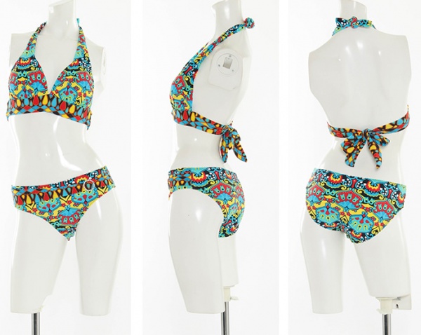 派手な模様と鮮やかな多色使いが注目を浴びそうなエスニック柄ビキニ。胸下と腰回りの生地は太めで、目立たず体型カバーしてくれます。