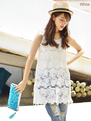 ◆ロング丈も透け感でサラリと着こなし写真左の総花柄ノースリーブチュニックは透け感のある花柄レースがキュート&セクシー!着丈は太ももの真ん中あたりまであり、身幅もゆとり感があるのでゆったりと着用できます。