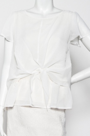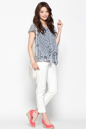 中央はギンガムチェックがキュートなシフォントップス。前結びが可愛くアクセントになっています。タイトスカートやパンツスタイルに合わせると、子供っぽくなりすぎずに、大人カジュアルになりますよ。