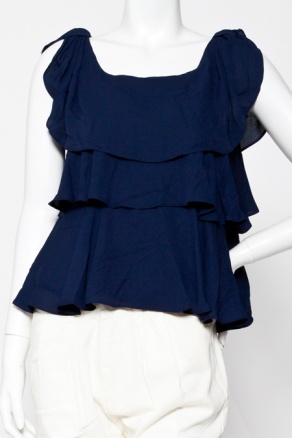 左はフリルが層になっていてひらひらと風に揺れる様子が夏らしいトップス。ショルダーには小さく結び目が作ってあるのも可愛いこだわりが感じられます。上着を羽織ればオフィスにも着ていけますね。