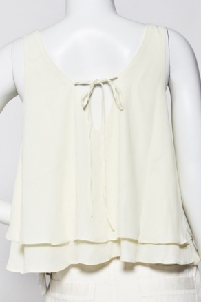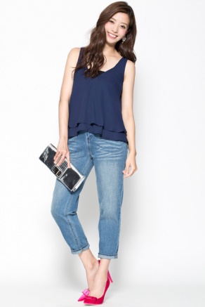右はバックとデコルテ部分が大きくあいた大胆なデザインのノースリーブトップス。露出が多いのに下品にならないのはシフォントップスならではです。V字ネックなので顔周りをシャープに見せる効果だって期待できますね。