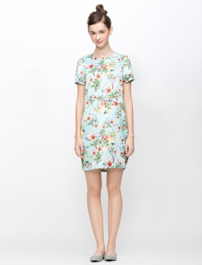 左は光沢感のある生地に大きくフラワーがプリントされたワンピース。インパクト大ですね。花柄だと甘くなってしまうものですが、トロピカルな雰囲気のある柄のため、大人キュートにまとまっています。