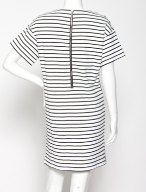 右はボーダーですっきりとまとまっているワンピース。カジュアルなゆるさは残しつつも肩の丸みやミニ丈がキュートさを感じさせます。バックのジップも大人っぽさを出し、引き締めていますね。
