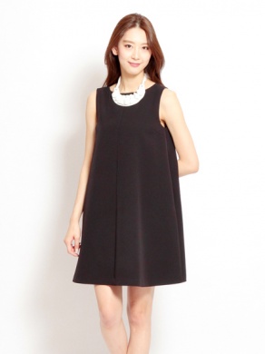 中央はローウエストからフレアに広がるノースリーブワンピース。ネックラインにはタックがアクセントとして置かれ、よりスタイリッシュな印象を与えています。すそがフィッシュテールになっているのもポイントですね。