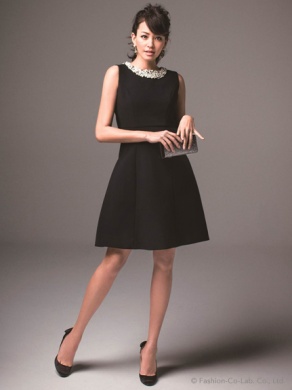 右は華やかなネックラインに注目の1枚。たくさんのパールビーズやビジューが散りばめられ、キラキラ好きにはたまらないですよね。フィットアンドフレアーなシルエットが美しく、スタイルアップだって期待できちゃいます。