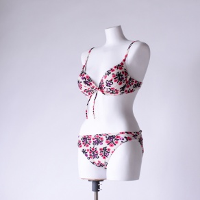 画像左は珍しいスミレ柄のプリントがなされたビキニ4点セット。ワイヤービキニなので、バストもしっかり盛ってくれますね。センターの小ぶりのリボンもキュート。