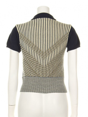 左は今トレンドの幾何学模様っぽいストライプが印象的な1枚。気持ち短めな着丈がレトロで可愛らしいですよね。スカートにもパンツにも合わせられる優秀なニットポロシャツです。