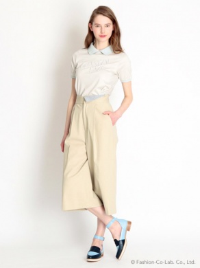 中央はセンターに入れられた大きなロゴ刺繍に目を引かれる1枚。裾には面ファスナーが付いているめずらしいシャツです。フレアスカートなどを合わせるのもおしゃれになりますね。