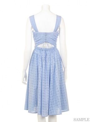 中央はワンピースですが、ビスチェとフレアスカートを合わせたコーデのようにも見える1枚。1着でおしゃれ上級者に見えますね。ボトムラインは長めで、動くと軽やかで上品に揺れる様子が印象的。背中のスピンドルもとってもガーリー!