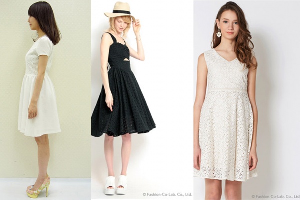 右は真っ白なフルレースが見た目にも涼しいワンピース。V字に広く開いた胸元はちょっぴりセクシーなのに清楚に見えます。小顔効果だって抜群ですよ。胸下に入った細いラインも脚長に見せてくれます。
