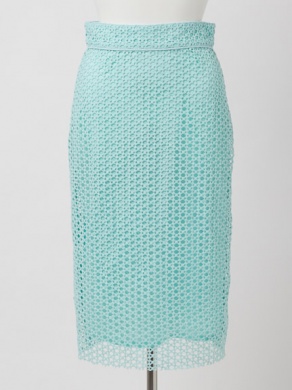 左はペパーミントカラーが爽やかな印象のレースタイトスカート。昨年に引き続き流行中のアイレットレースを贅沢に使用していて、小さな花柄が可愛らしいですね。