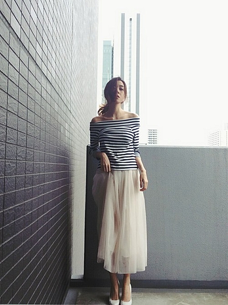 ふわっと層のあついシフォンスカートもオフショルのボーダーと合わせて印象激変。