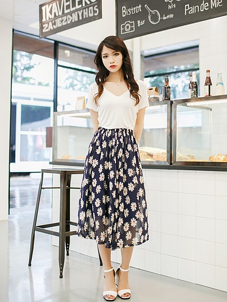広がり過ぎないシルエットが大人なシフォンスカートに合わせるのは断然シンプルTシャツ。